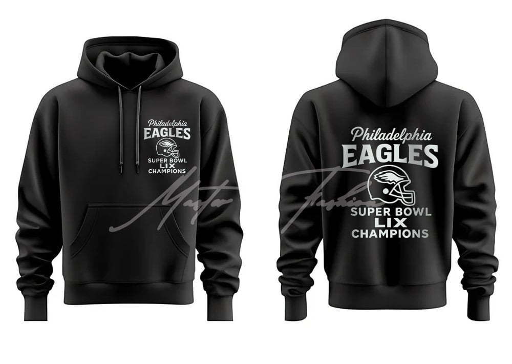 Show your pride in style with the Philadelphia Eagles Super Bowl LIX Champions Hoodie. Featuring the official championship logo on the left chest and a bold, oversized graphic on the back, this hoodie delivers the perfect blend of comfort and team spirit. Crafted from premium heavyweight fabric, it offers a soft interior lining, an adjustable drawstring hood, and a spacious front pocket for everyday wear. Available in classic black and authentic Kelly green, this hoodie is designed for die-hard Eagles fans who want to represent their team with confidence on game day and beyond.