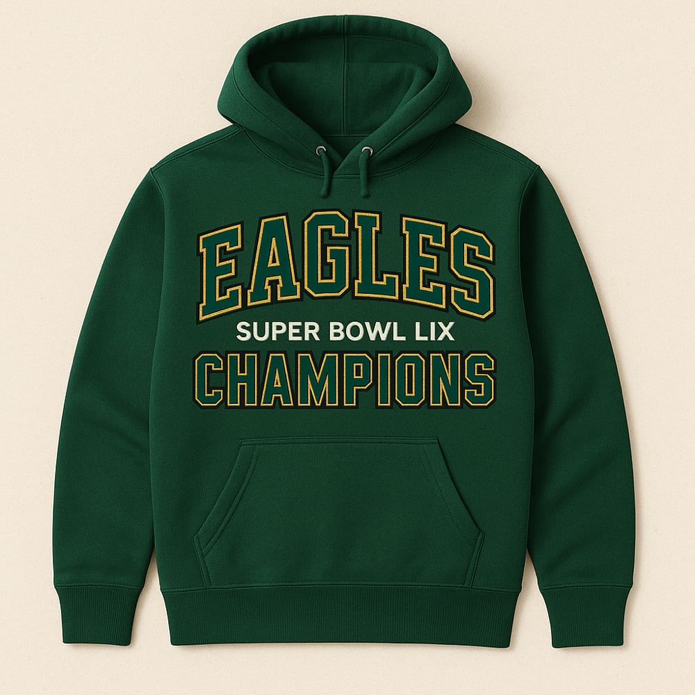 Celebrate greatness with this standout tribute to football history. Designed in a sleek cream base, this hoodie features “Eagles” across the chest in bold green with gold, black, and white trim, commemorating Super Bowl LIX Champions. From tailgates to city streets, this piece blends sports heritage with fashion-forward edge.