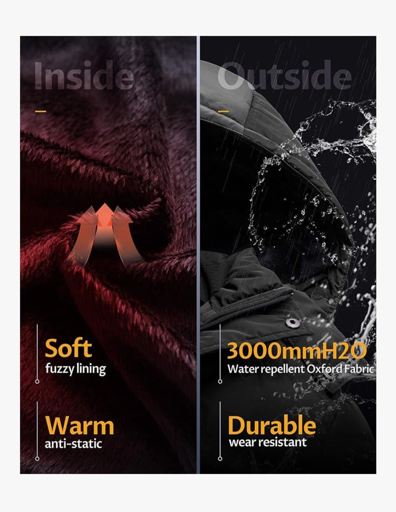 • ☞Waterproof winter jacket--Durable water repellent finish sloughs off moisture and wet snow and keep the inside dry, reducing washing times.