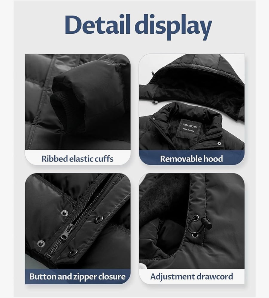 • ☞Windproof winter coat--high quality sbs zipper, detachable hooded with adjustable drawstring, stretch cuff to protect you in the winter months.