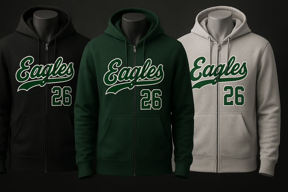 Rep your team in style with our Eagles Script Zip Hoodie. This hoodie combines comfort, bold design, and game-day energy for the perfect streetwear piece. Featuring the classic Eagles script logo across the chest and your choice of player number — #1, #11, or #26 — this design delivers a sleek and timeless look.