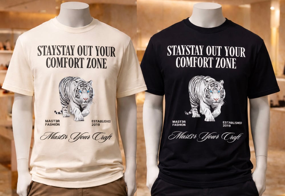 Featuring a bold front graphic with a striking white tiger and the statement “STAY OUT YOUR COMFORT ZONE”, this design represents discipline, hunger, and elevation. Finished with the MAST3R FASHION branding and “Master Your Craft” script, this tee speaks to those committed to growth in every area.